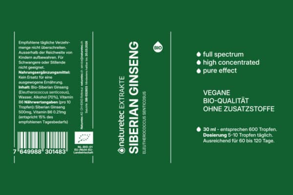 Hochwertiger Flüssigextrakt aus 100% Bio-Wurzel des Sibirischen Ginsengs, aus kontrolliert biologischem Anbau. Die Herstellung erfolgt ohne Druck und Hitze, um die natürlichen Inhaltsstoffe bestmöglich zu erhalten. Durch Dual-Extraktion mit Wasser und Premium Ethanol bleibt das vollständige natürliche Wirkstoffspektrum erhalten. Die Pflanze Eleutherococcus senticosus stammt ursprünglich aus der Taiga-Region in Sibirien und ist daher unter dem Namen „Taigawurzel“ bekannt. Sie enthält Eleutheroside und weitere sekundäre Pflanzenstoffe, die traditionell mit physischer Ausdauer, Erholung und Widerstandsfähigkeit in Verbindung gebracht werden. Der Extrakt enthält keine Füllstoffe oder Zusatzstoffe. Geeignet für die tägliche Anwendung.